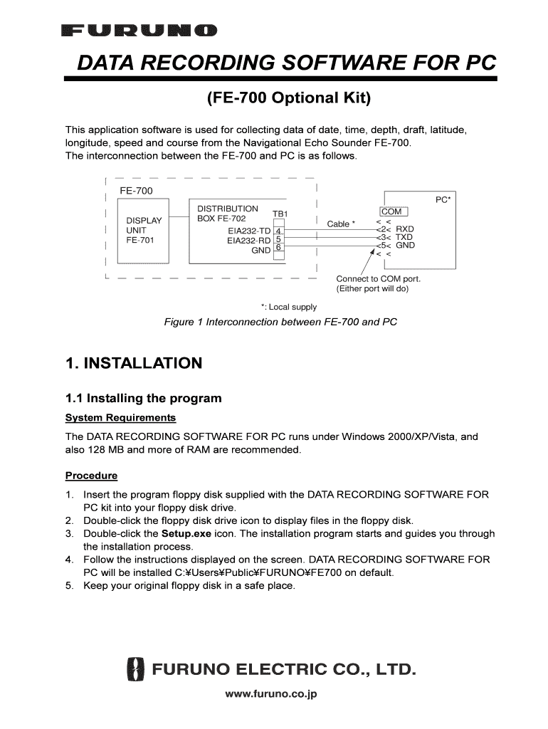Backdate RECORDING SOFTWARE FOR PC (FE700 Optional Kit) This application software is used for collecting data of date, time, depth, draft, latitude, longitude, speed and course from the Navigational