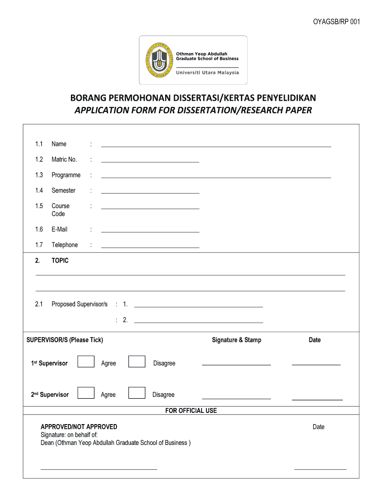 FLAGS/RP 001BORANG PERMOHONAN DISSERTATION/ERAS PENYELIDIKAN APPLICATION FORM FOR DISSERTATION/RESEARCH PAPER 1.1Name: 1.2Matric No.: 1.3Programme: 1.4Semester: 1.5Course Code: 1.6EMail: 1.7Telephone: