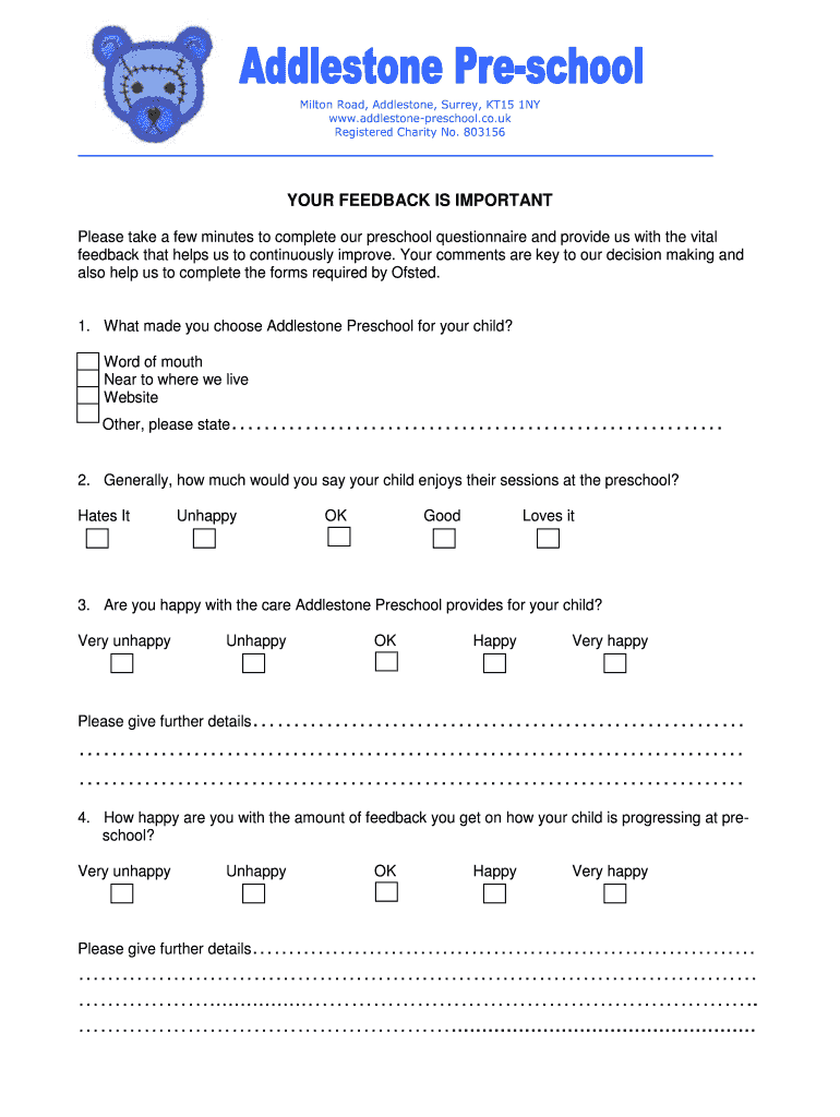 Milton Road, Addlestone, Surrey, KT15 1NY www.addlestonepreschool.co.uk Registered Charity No. 803156 YOUR FEEDBACK IS IMPORTANT Please take a few minutes to complete our preschool questionnaire and