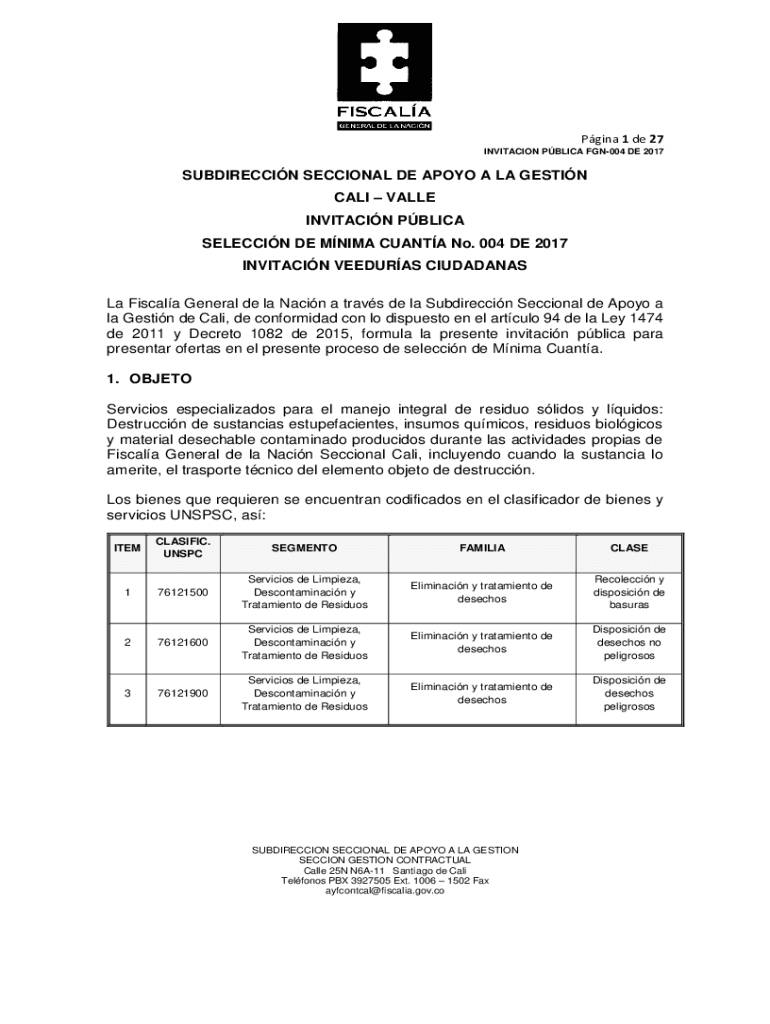 Gina 1 DE 27 INVITATION PBL ICA FGN004 DE 2017SUBDIRECCIN SECTIONAL DE APOLLO À la GETTING CALI VALUE INVITATION PBL ICA SELECTION DE MINIMA QUANTA No. 004 DE 2017 INVITATION VENDORS CIUDADANAS La