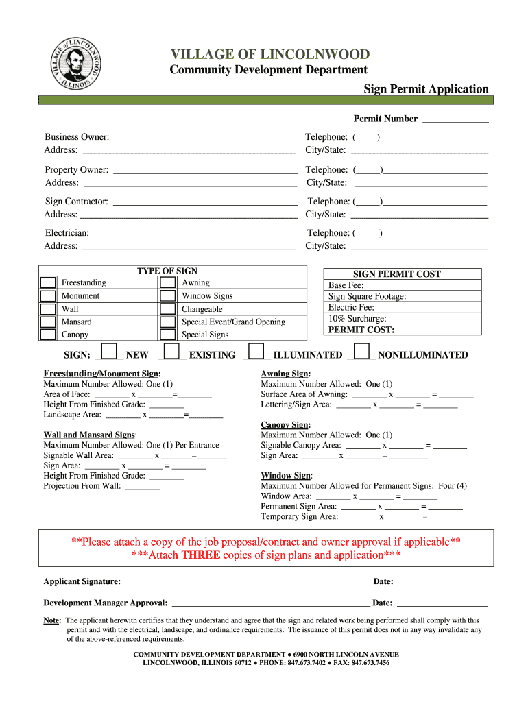VILLAGE OF LINCOLNTON Community Development Department Sign Permit Application Permit Number Business Owner: Telephone: () Address: City/State: Property Owner: Telephone: () Address: City/State: Sign