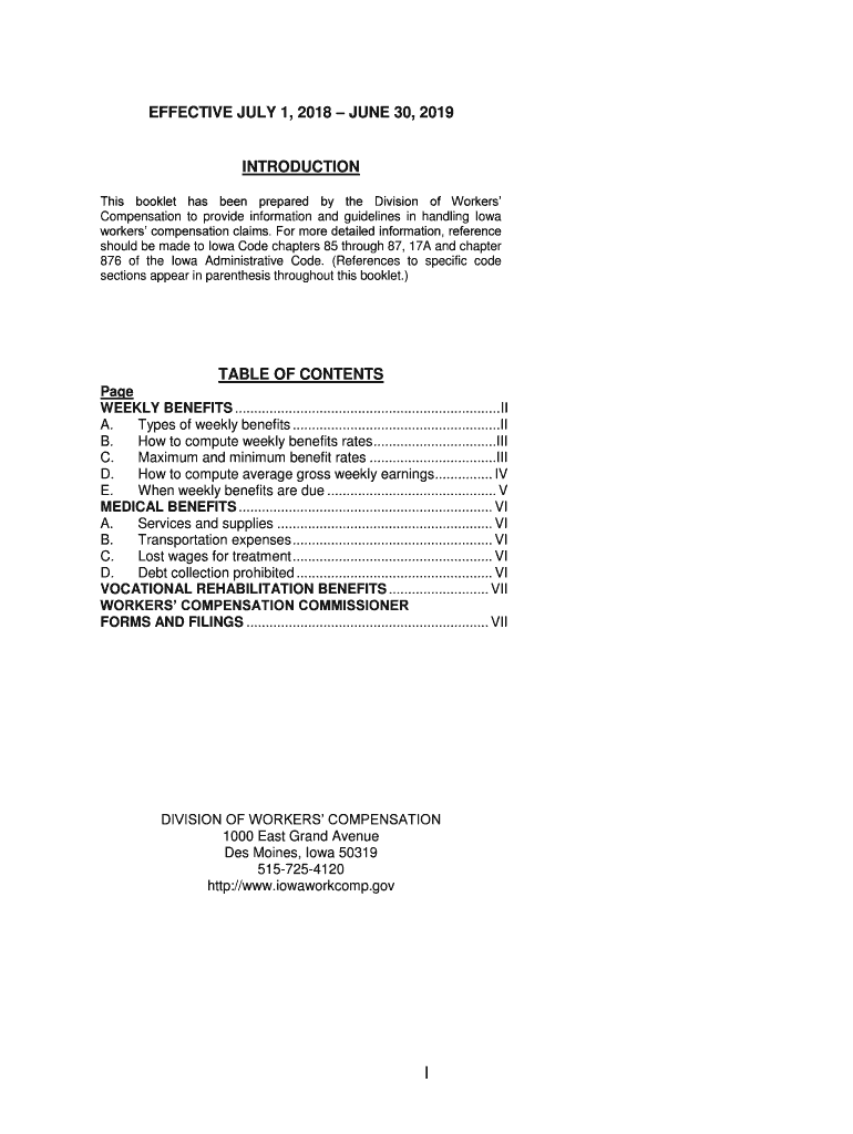 EFFECTIVE JULY 1, 2018, JUNE 30, 2019INTRODUCTION This booklet has been prepared by the Division of Workers Compensation to provide information and guidelines in handling Iowa workers compensation