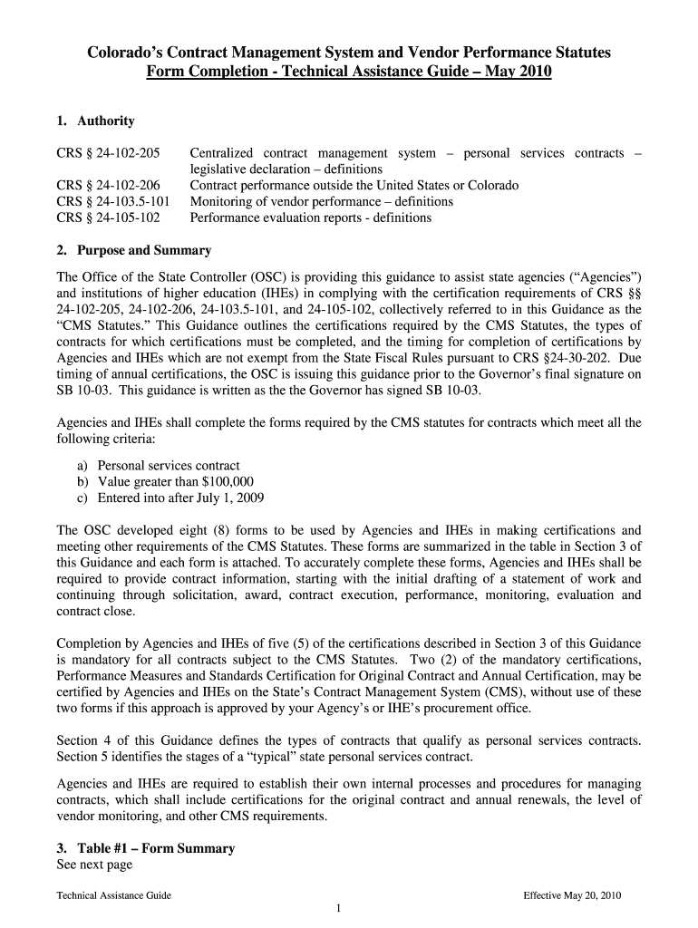 Colorado's Contract Management System and Vendor Performance Statutes Form Completion Technical Assistance Guide May 2010 1. Authority CRS 24102205 CRS 24102206 CRS 24103.5101 CRS 24105102 Centralized