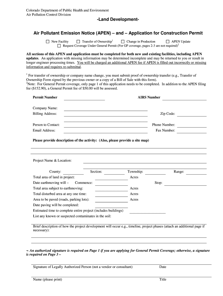 Get the free -Land DevelopmentAir Pollutant Emission Notice (APEN) and Application for Constructi...