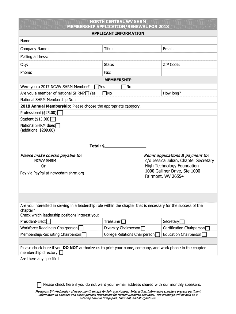 Get the free NORTH CENTRAL WV SHRM MEMBERSHIP