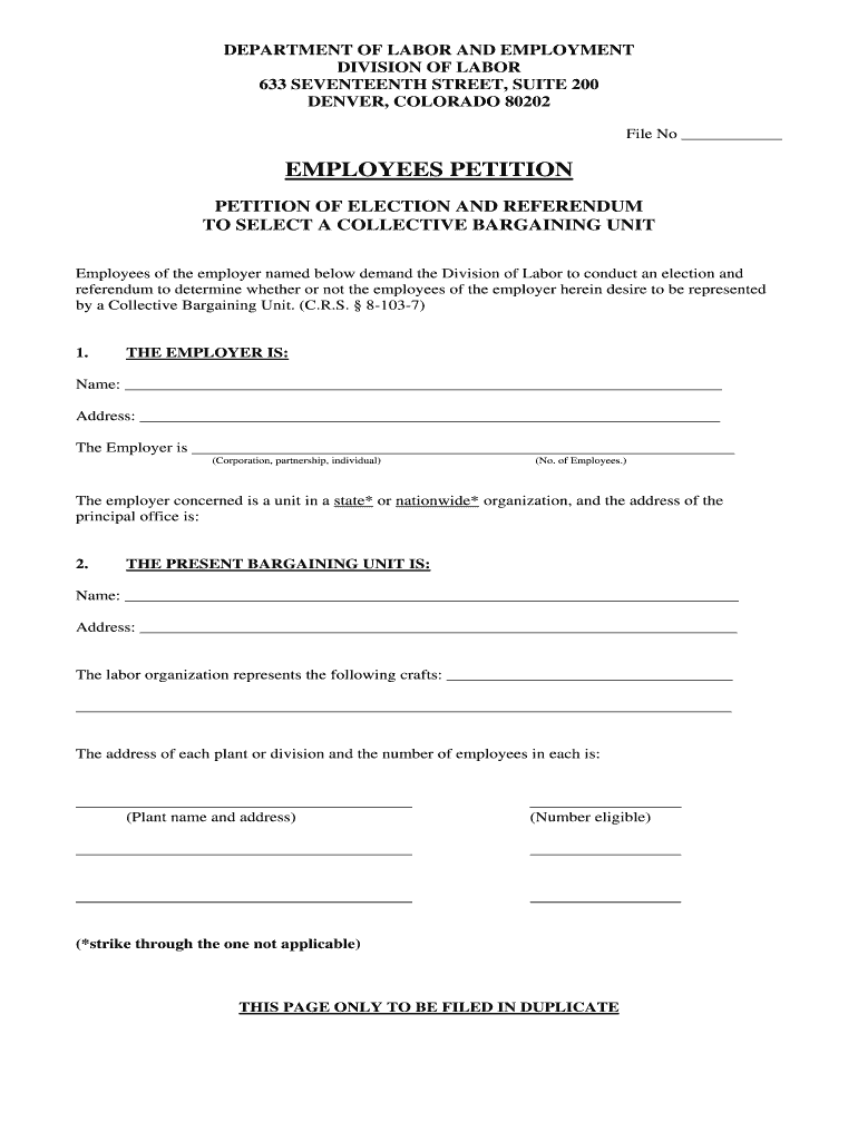 This petition can be initiated by employees within a specific organization and must be filed with the Colorado Division of Labor. The division plays an essential role in supervising the process and ensuring compliance with labor laws related to employee representation.