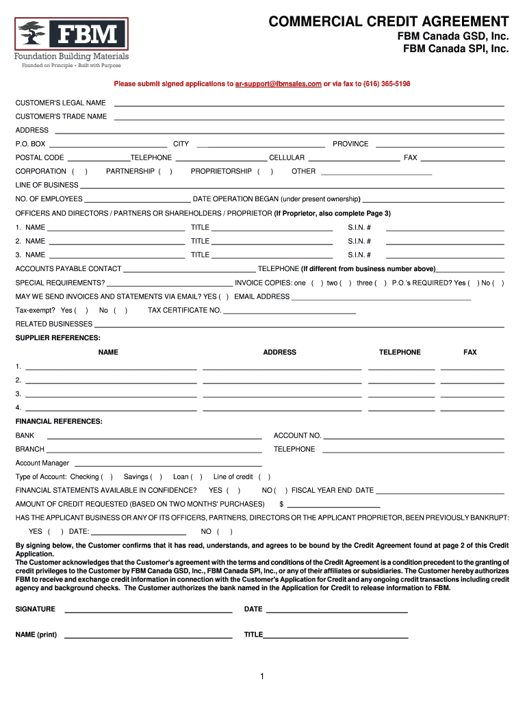 The Commercial Credit Agreement is a business contract used by FBM Canada to establish credit terms with customers for purchasing building materials.