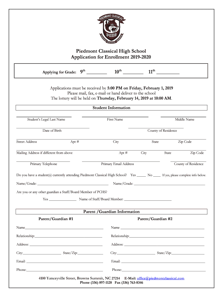 Piedmont Classical High School Application for Enrollment 20192020 Applying for Grade:9th 10th 11th Applications must be received by 5:00 PM on Friday, February 1, 2019, Please mail, fax, email or