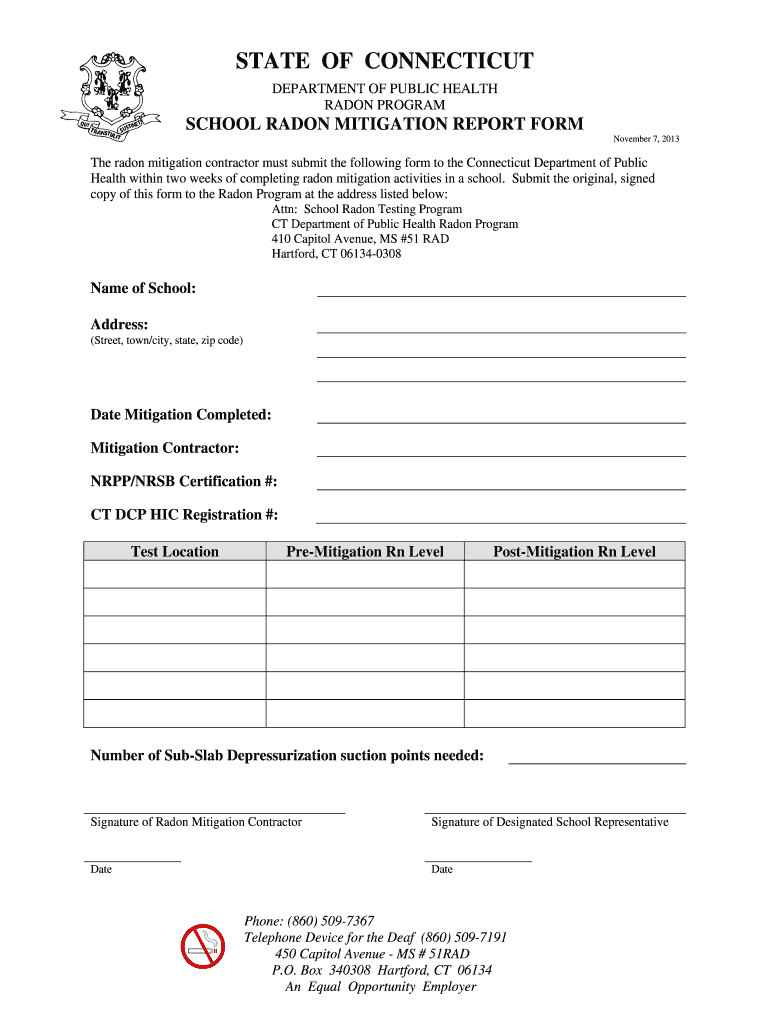 STATE OF CONNECTICUT DEPARTMENT OF PUBLIC HEALTH RADON PROGRAM SCHOOL RADON MITIGATION REPORT FORM November 7, 2013, The radon mitigation contractor must submit the following form to the Connecticut