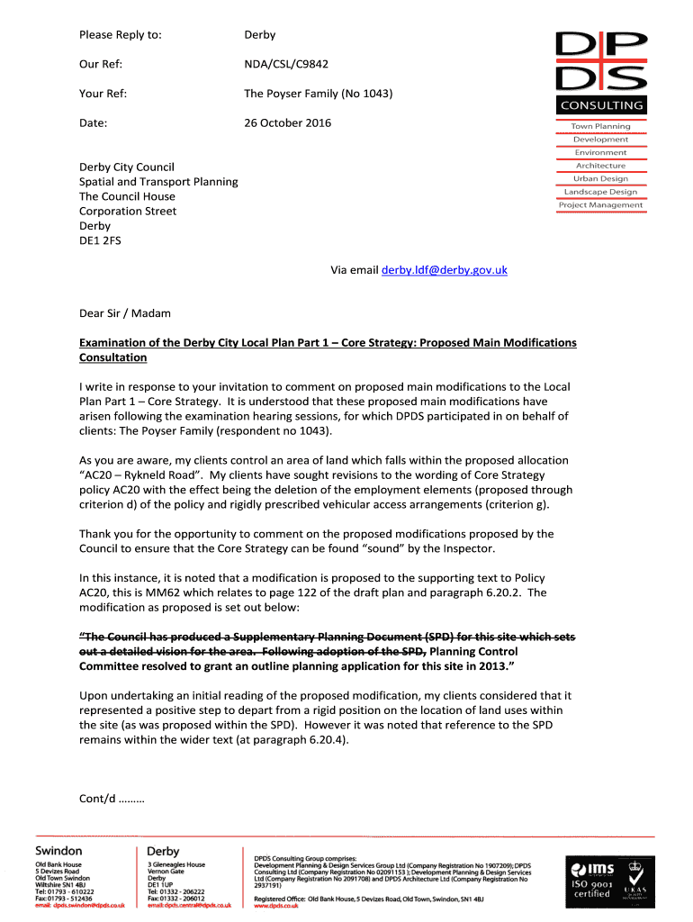 Please Reply to:Derby Ref:NDA/CSL/C9842Your Ref:The Poser Family (No 1043)Date:26 October 2016Derby City Council Spatial and Transport Planning The Council House Corporation Street Derby DE1 2FS Via