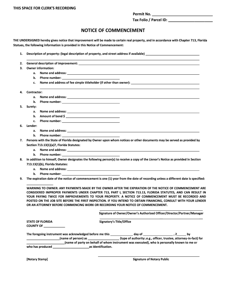 THIS SPACE FOR CLERKS RECORDING Permit No. Tax Folio / Parcel ID: NOTICE OF COMMENCEMENT THE UNDERSIGNED hereby gives notice that improvement will be made to certain real property, and in accordance