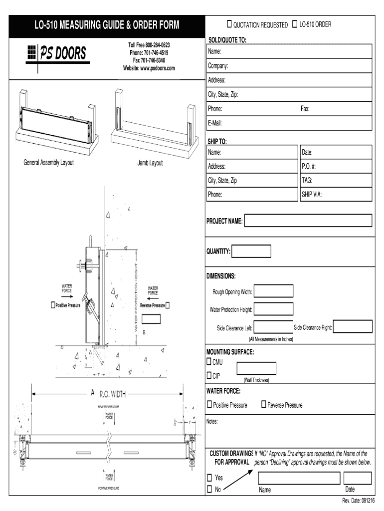 LO510 MEASURING GUIDE & ORDER FORM Toll Free 8002840623 Phone: 7017464519 Fax 7017468340 Website: www.psdoors.comQUOTATION REQUESTEDLO510 OVERSOLD/QUOTE TO: Name: Company: Address: City, State, Zip: