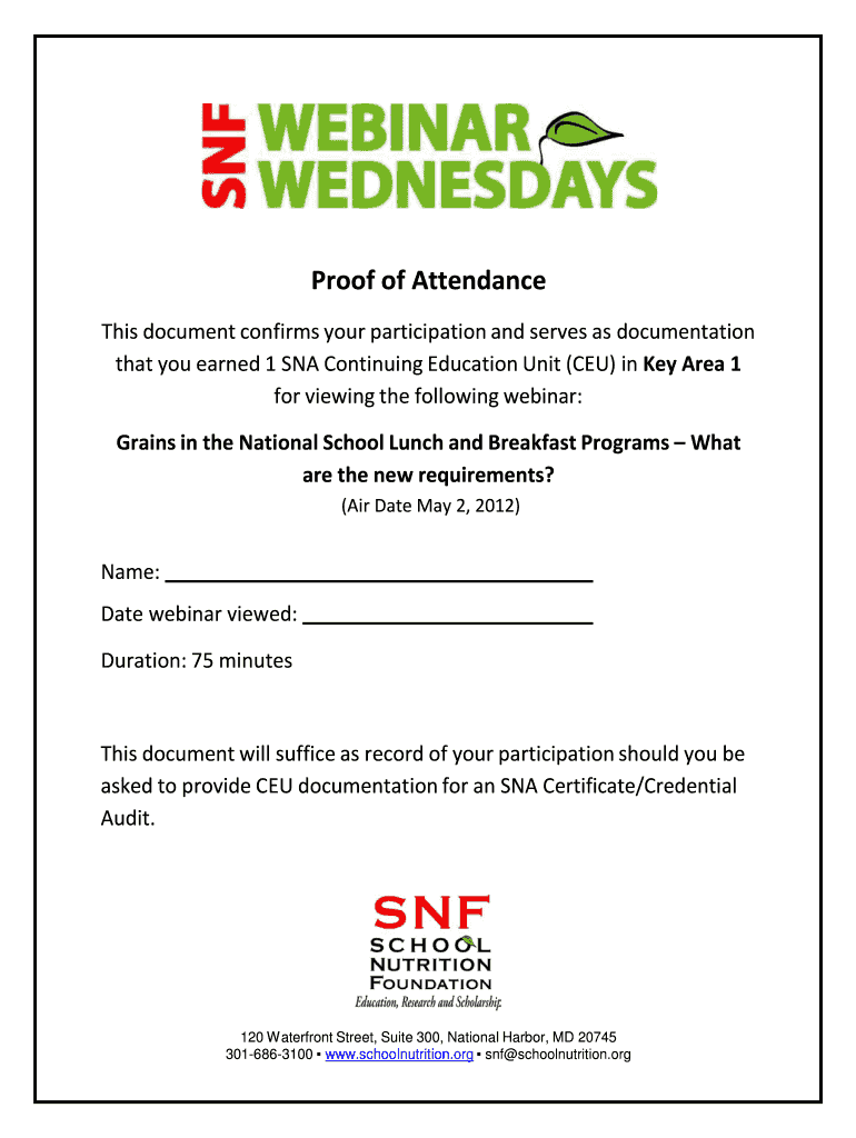 Proof of Attendance This document confirms your participation and serves as documentation that you earned 1 SNA Continuing Education Unit (CEU) in Key Area 1 for viewing the following webinar: Grains