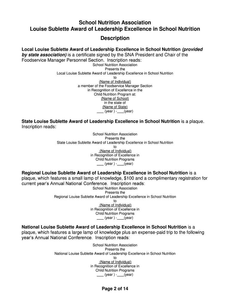 Get the free Louise Sublette Award of Excellence - School Nutrition Association