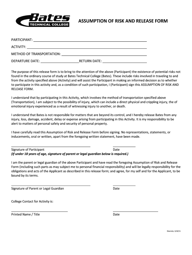 The Assumption of Risk and Release Form is a document used by Bates Technical College to inform participants of potential risks associated with college-sponsored activities and to release the college from liability.