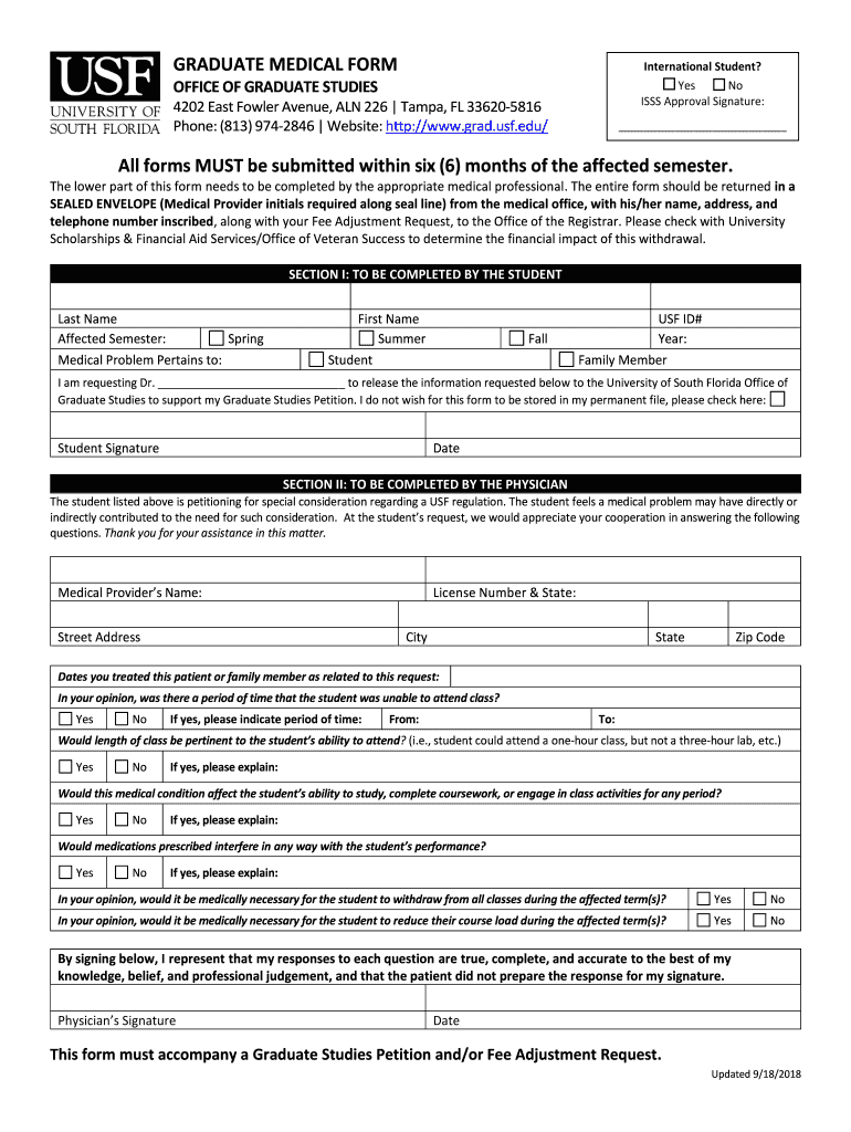 GRADUATE MEDICAL FORMInternational Student? Yes No ISIS Approval Signature:OFFICE OF GRADUATE STUDIES 4202 East Fowler Avenue, ALN 226 Tampa, FL 336205816 Phone: (813) 9742846 Website: http://www.grad.usf.edu/