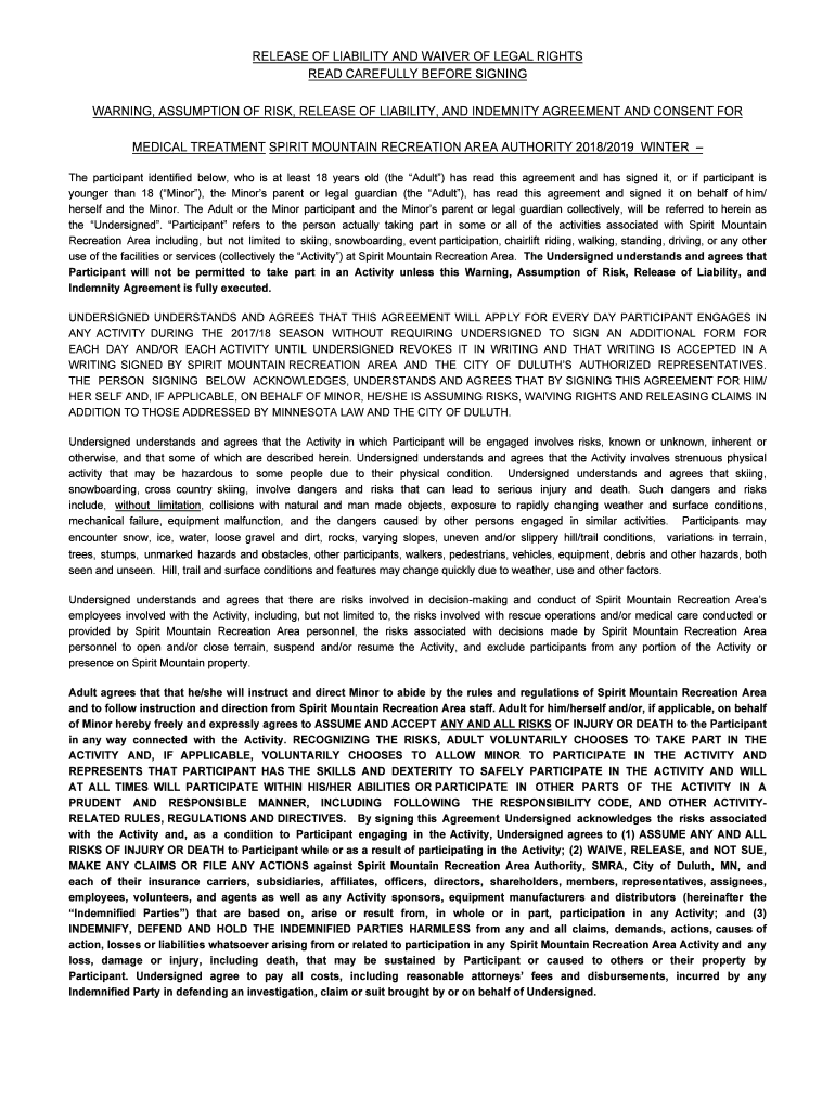 RELEASE OF LIABILITY AND WAIVER OF LEGAL RIGHTS READ CAREFULLY BEFORE SIGNING WARNING, ASSUMPTION OF RISK, RELEASE OF LIABILITY, AND INDEMNITY AGREEMENT AND CONSENT FOR MEDICAL TREATMENT SPIRIT MOUNTAIN