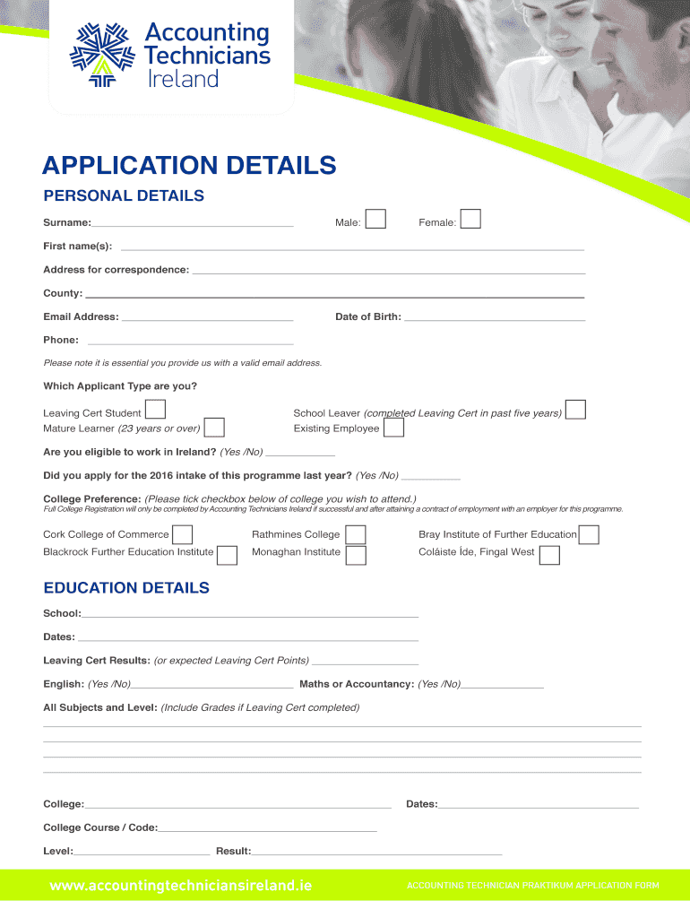 APPLICATION DETAILS PERSONAL DETAILS Surname:Male:Female:First name(s): Address for correspondence: County: Date of Birth:Email Address: Phone: Please note it is essential you provide us with a valid