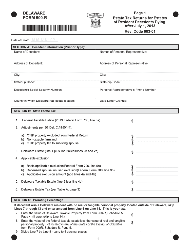 The Delaware Form 900-R needs to be filed by personal representatives of estate taxes for residents who passed away after July 1, 2013, as it reports and calculates estate taxes.