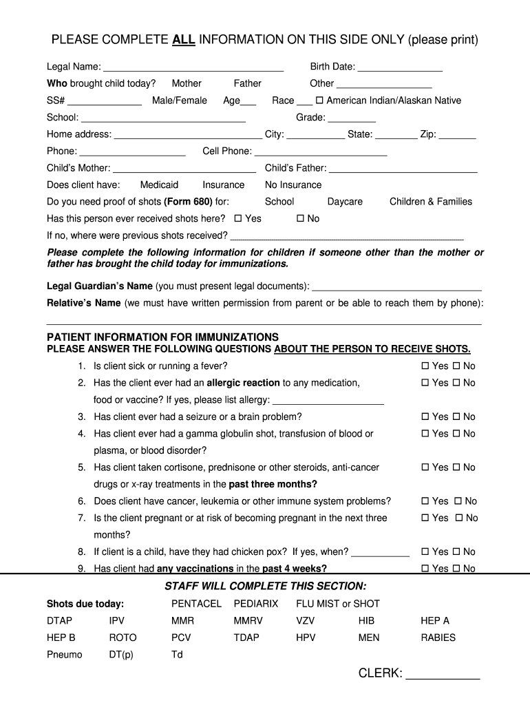 PLEASE COMPLETE ALL INFORMATION ON THIS SIDE ONLY (please print) Legal Name: Birth Date: Who brought child today? Other SS# Mother Father Male/Female Age Race School: American Indian/Alaskan Native