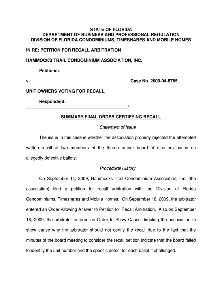 STATE OF FLORIDA DEPARTMENT OF BUSINESS AND PROFESSIONAL REGULATION DIVISION OF FLORIDA CONDOMINIUMS, TIMESHARES AND MOBILE HOMES IN RE: PETITION FOR RECALL ARBITRATION HAMMOCKS TRAIL CONDOMINIUM
