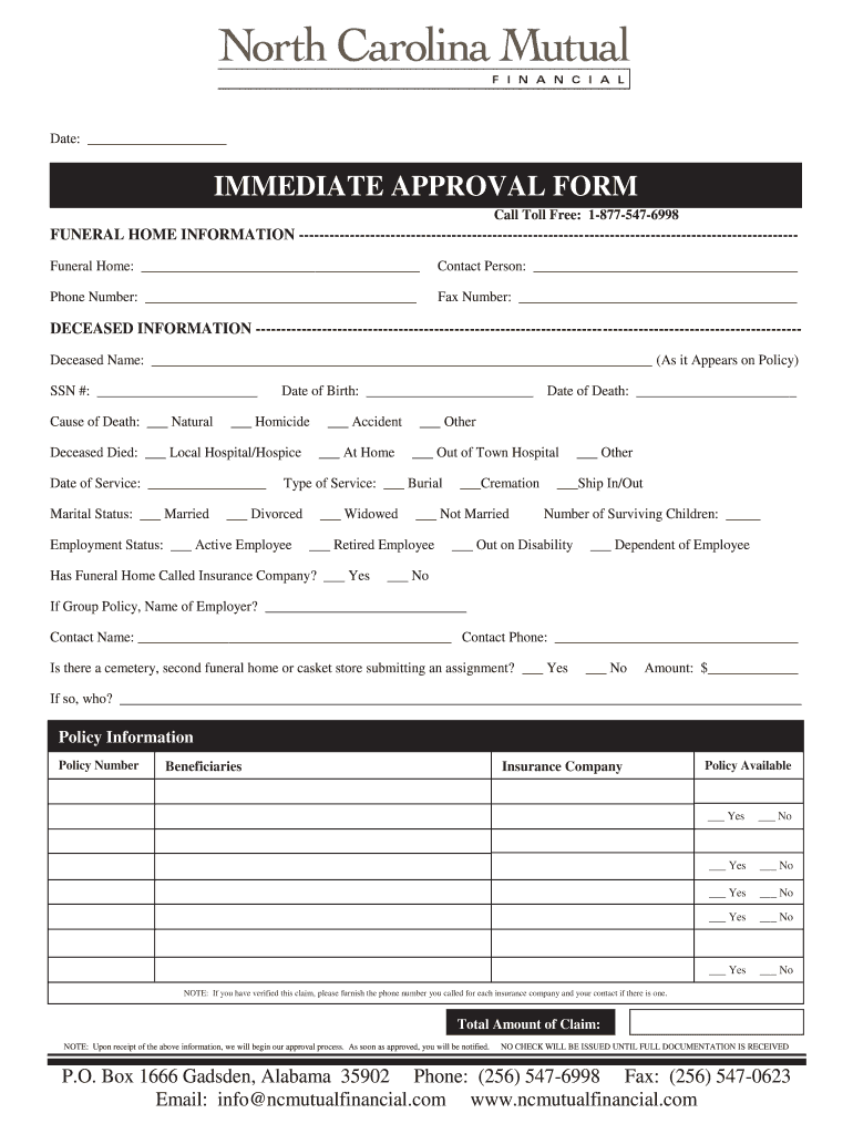 Date: Call Toll Free: 1-877-547-6998 FUNERAL HOME INFORMATION----------------------------------------------------------------------From: (Funeral Home) Contact Person: Phone Number: Fax Number: DECEASED