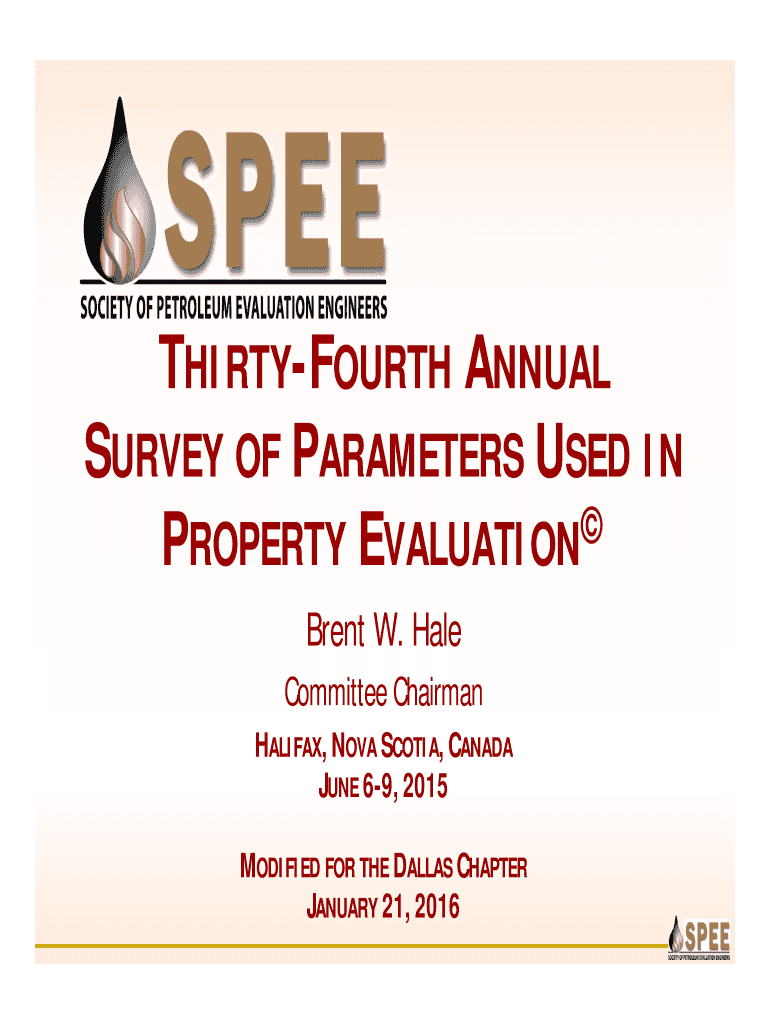 THIRTYFOURTH ANNUAL SURVEY OF PARAMETERS USED IN PROPERTY EVALUATION Brent W. Hale Committee Chairman HALIFAX, NOVA SCOTIA, CANADA JUNE 69, 2015 MODIFIED FOR THE DALLAS CHAPTER JANUARY 21, 2016Part