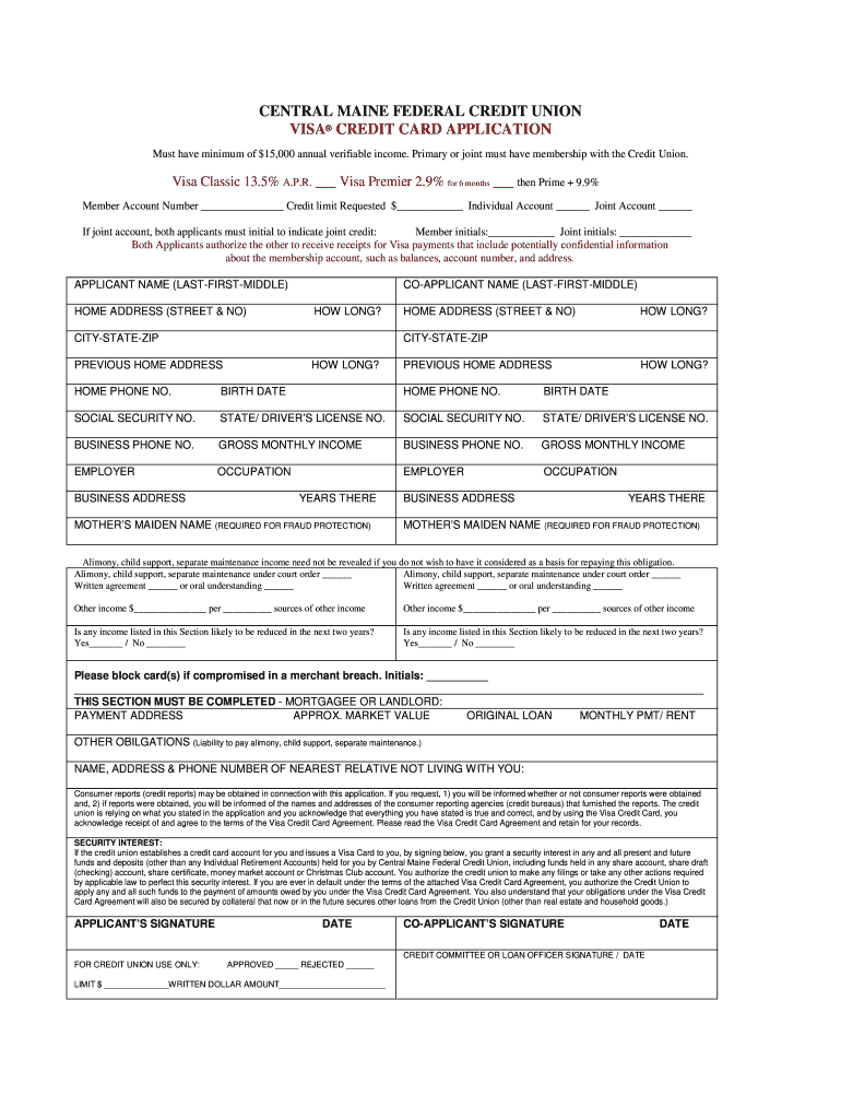 CENTRAL MAINE FEDERAL CREDIT UNION VISA CREDIT CARD APPLICATION Must have minimum of $15,000 annual verifiable income. Primary or joint must have membership with the Credit Union. Visa Classic 13.5×
