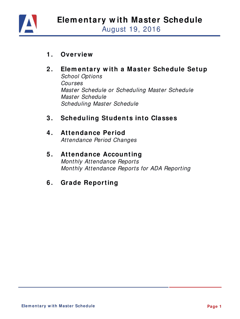 August 19, 20161. Overview2. Elementary with a Master Schedule Setup3. Scheduling Students into Classes4. Attendance Period5. Attendance Accounting6. Grade ReportingSchool