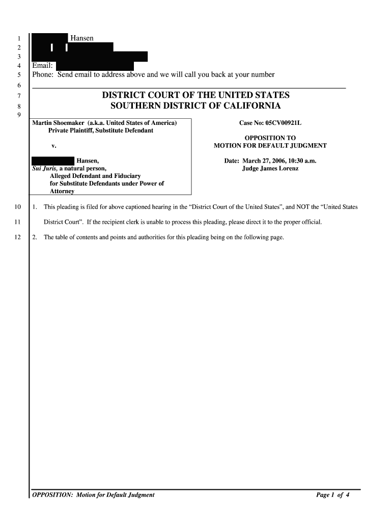 1 2 3 4 5 6 7 8 9 Hansen Email: Phone: Send email to address above, and we will call you back at your number DISTRICT COURT OF THE UNITED STATES SOUTHERN DISTRICT OF CALIFORNIA Martin Shoemaker (a.k.a.