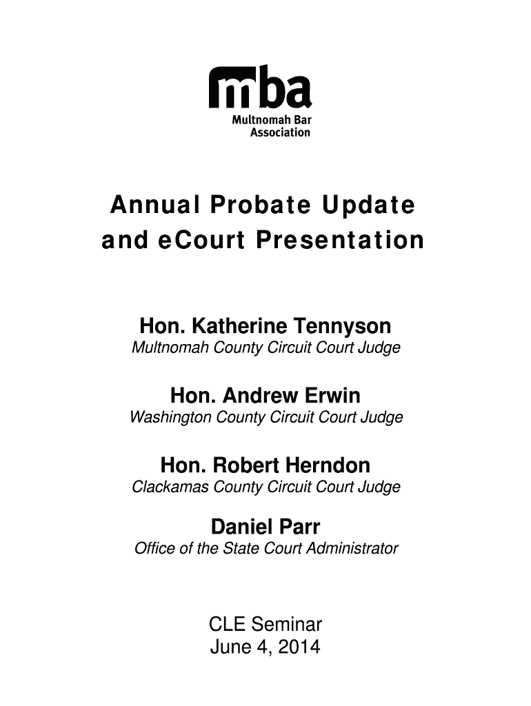 Annual Probate Update and court Presentation Hon. Katherine Tennyson Multnomah County Circuit Court Judge Hon. Andrew Erwin Washington County Circuit Court Judge Hon. Robert Herndon Clackamas County