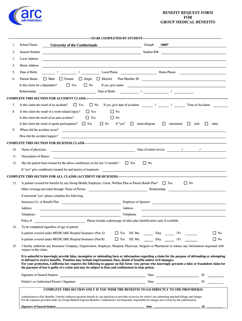 The Benefit Request Form for Group Medical Benefits is a medical billing form used by insured students at the University of the Cumberlands to request medical benefits for accidents or illnesses.