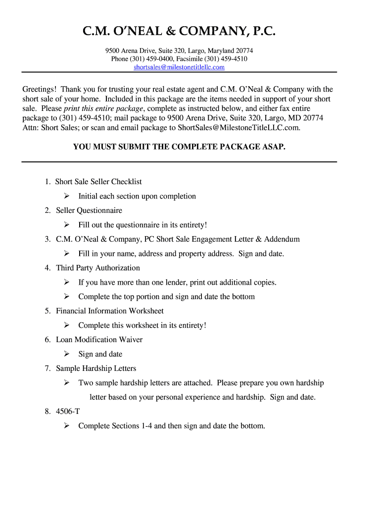 Before submitting the Short Sale Package, homeowners should prepare the following items: