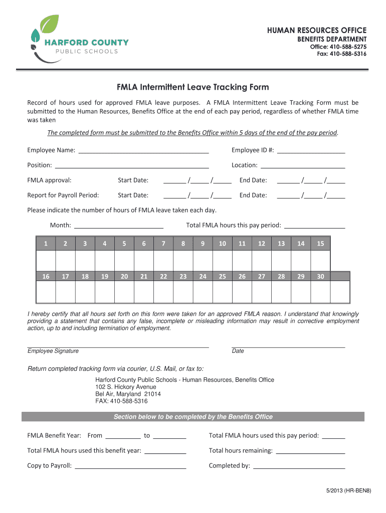 The completed FMLA Intermittent Leave Tracking Form must be submitted within 5 days of the end of each pay period, regardless of whether leave was taken.