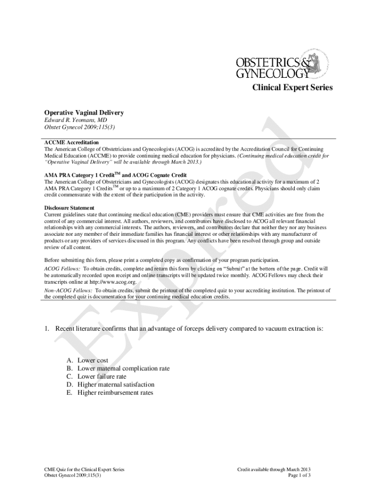 The Operative Vaginal Delivery CME Quiz is available for completion until March 2013. Make sure to submit your form before this date.
