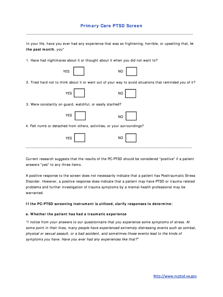 The Primary Care PTSD Screen is a medical form used by healthcare professionals to assess patients for potential Posttraumatic Stress Disorder (PTSD).