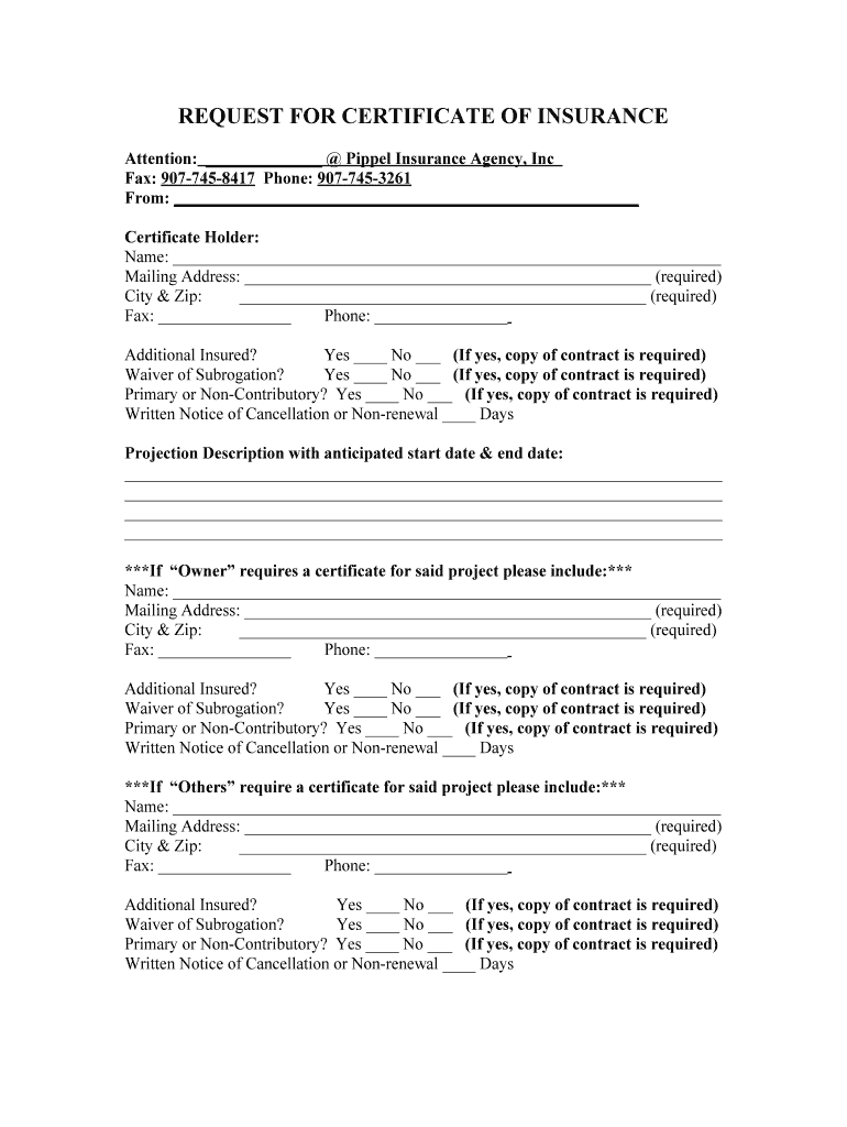 The Request for Certificate of Insurance is a business form used by companies to obtain a certificate of insurance from an insurance agency, ensuring proper coverage for their projects.