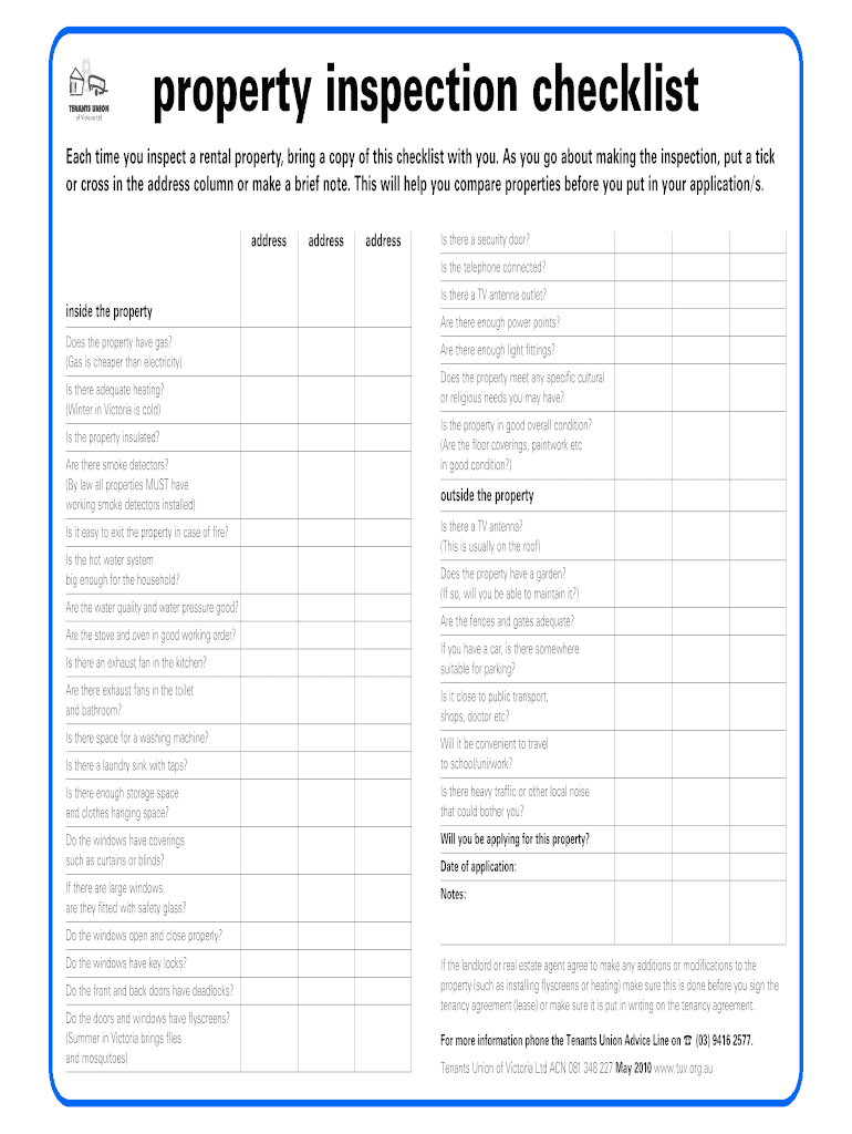 Each time you inspect a rental property, bring a copy of this checklist with you. As you go about making the inspection, put a tick