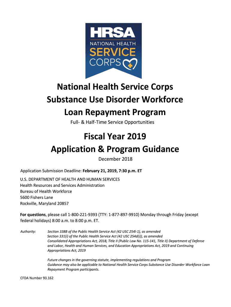 National Health Service Corps Substance Use Disorder Workforce Loan Repayment Program Full & Halftime Service OpportunitiesFiscal Year 2019 Application & Program Guidance December 2018Application