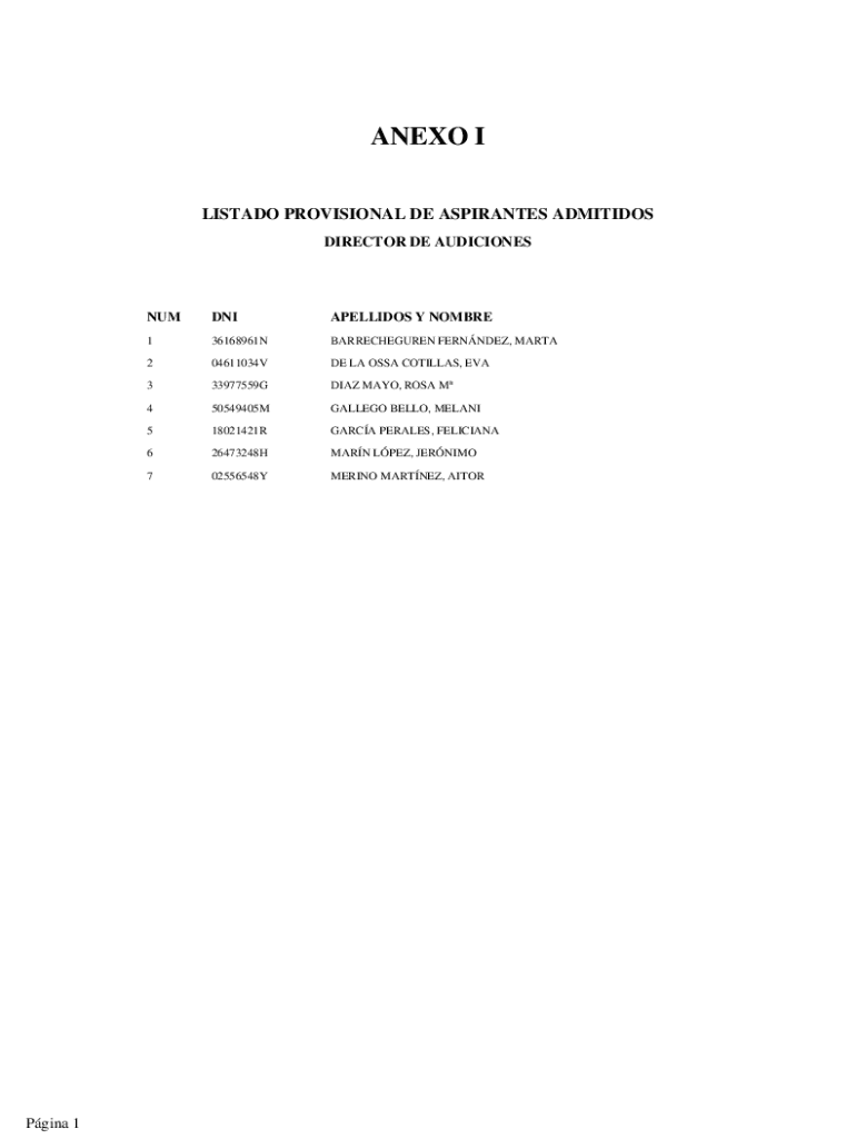 NEXT I LISTED PROVISIONAL DE ASPIRANTS ADDITION DIRECTOR DE AUDICIONESPgina 1NUMDNIAPELLIDOS Y NOMBRE136168961NBARRECHEGUREN FERNANDEZ, MARTA204611034VDE LA SSA GORILLAS, EVA333977559GDIAZ MAYO, ROSA