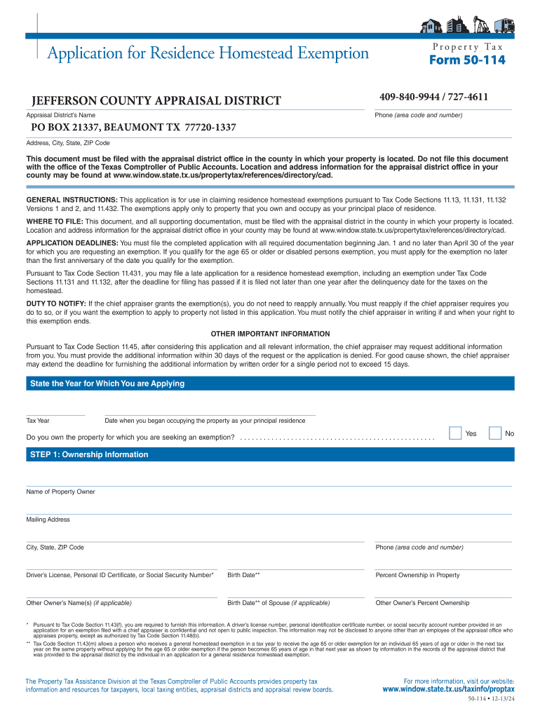 The Texas Residence Homestead Exemption Application (Form 50-114) is a tax form used by property owners in Texas to claim exemptions on their primary residence.