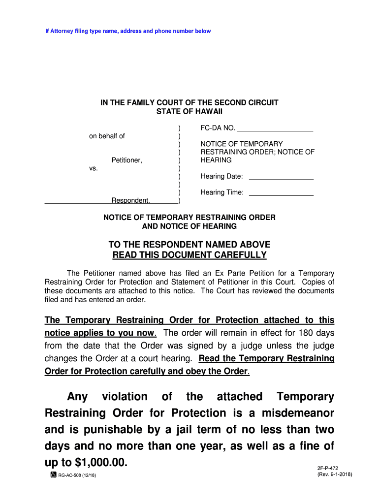 If Attorney filing type name, address and phone number below IN THE FAMILY COURT OF THE SECOND CIRCUIT STATE OF HAWAII on behalf petitioner, vs. Respondent.) )))))))))CDA NO. NOTICE OF TEMPORARY RESTRAINING