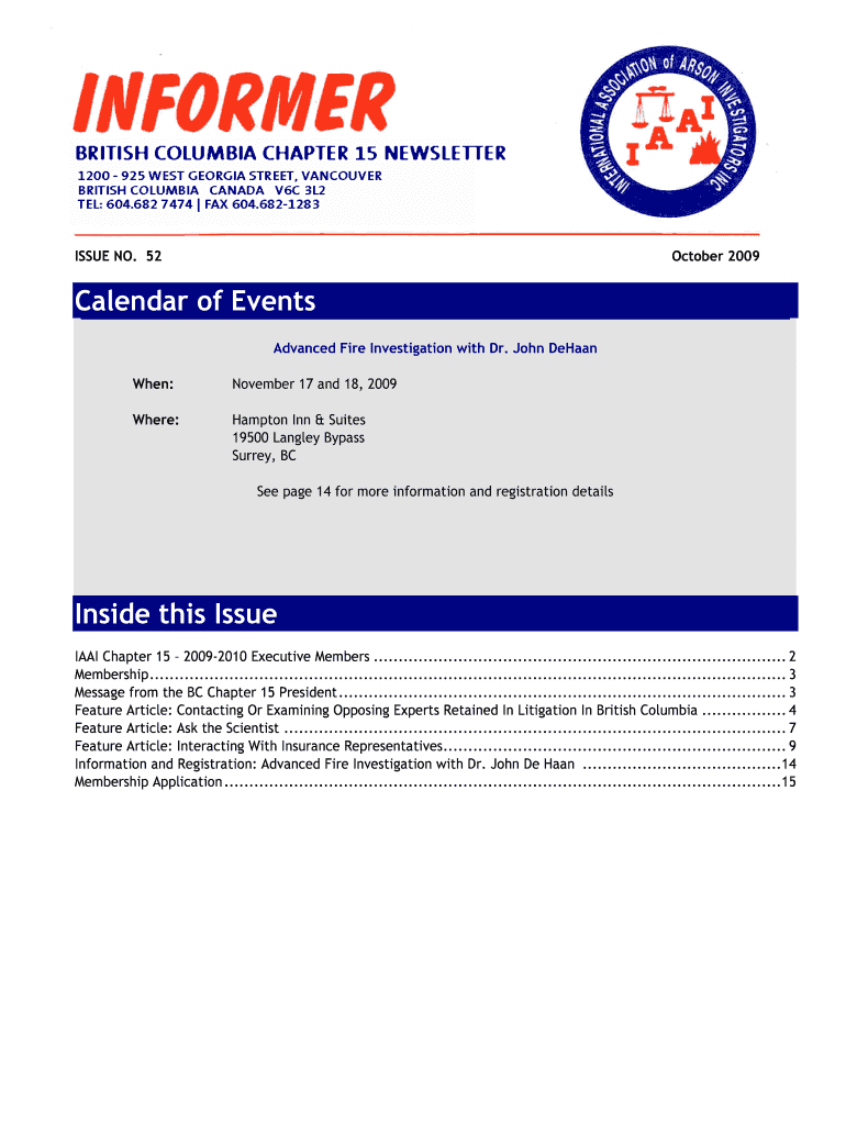 ISSUE NO. 52October 2009Calendar of Events Advanced Fire Investigation with Dr. John Dean When:November 17 and 18, 2009Where:Hampton Inn & Suites 19500 Langley Bypass Surrey, BC See page 14 for more