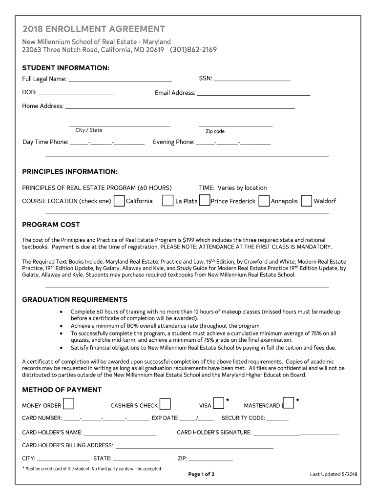 2018 ENROLLMENT AGREEMENT New Millennium School of Real Estate Maryland 23063 Three Notch Road, California, MD 20619 (301)8622169 STUDENT INFORMATION: Full Legal Name: DOB: SSN: Email Address: Home