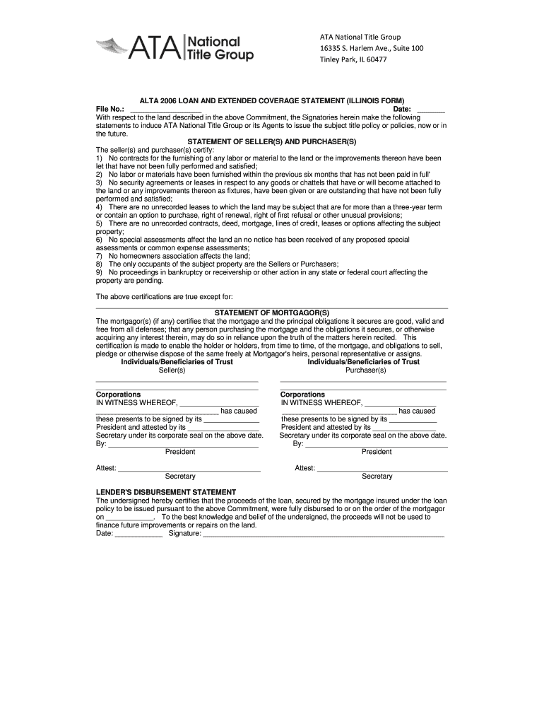 ATA National Title Group 16335 S. Harlem Ave., Suite 100 Tinley Park, IL 60477ALTA 2006 LOAN AND EXTENDED COVERAGE STATEMENT (ILLINOIS FORM) File No.: Date: With respect to the land described in the