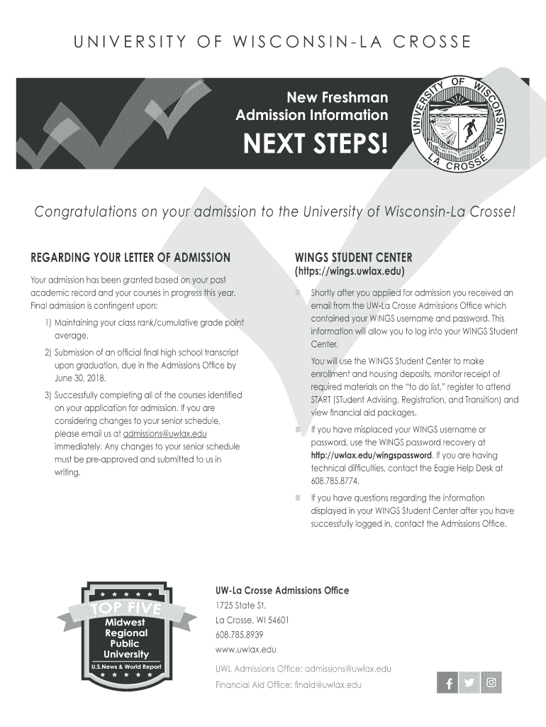 Congratulations on your admission to the University of Wisconsin La Cross!