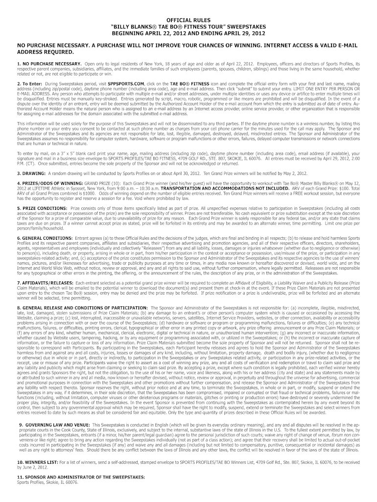 OFFICIAL RULES BILLY BLANKS TAE BO FITNESS TOUR SWEEPSTAKES BEGINNING APRIL 22, 2012, AND ENDING APRIL 29, 2012, NO PURCHASE NECESSARY. A PURCHASE WILL NOT IMPROVE YOUR CHANCES OF WINNING. INTERNET