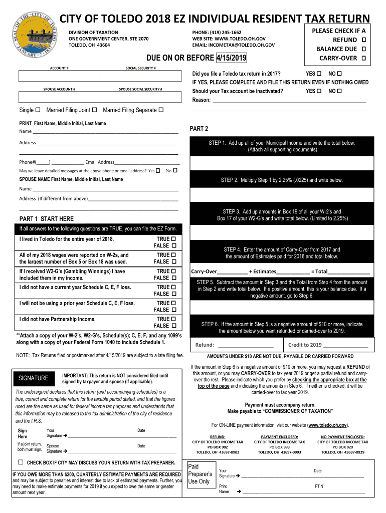 CITY OF TOLEDO 2018 EZ INDIVIDUAL RESIDENT TAX RETURN DIVISION OF TAXATION ONE GOVERNMENT CENTER, STE 2070 TOLEDO, OH 43604PLEASE CHECK IF A REFUND BALANCE DUE CARRYOVER PHONE: (419) 2451662 Website: