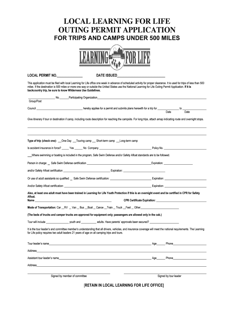 The Local Learning for Life Outing Permit Application is a personal form used by organizations to secure permission for trips and camps under 500 miles.