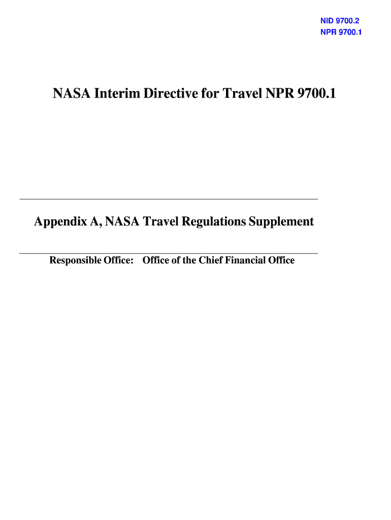 NID 9700.2 NPR 9700.1NASA Interim Directive for Travel NPR 9700.1Appendix A, NASA Travel Regulations Supplement Responsible Office: Office of the Chief Financial OfficeAPPENDIX A. NASA Travel Regulations